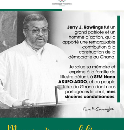Le Président de la République, Faure Essozimna Gnassingbé a adressé un message de condoléances à son homologue ghanéen Nana Akufo-Addo, à la suite du décès ce jeudi de l’ancien président Jerry John Rawlings. Le Chef de l’Etat a rendu un vibrant hommage à l’illustre disparu, et exprimé à sa famille, au Président Nana Akufo Addo et au peuple ghanéen ses ...